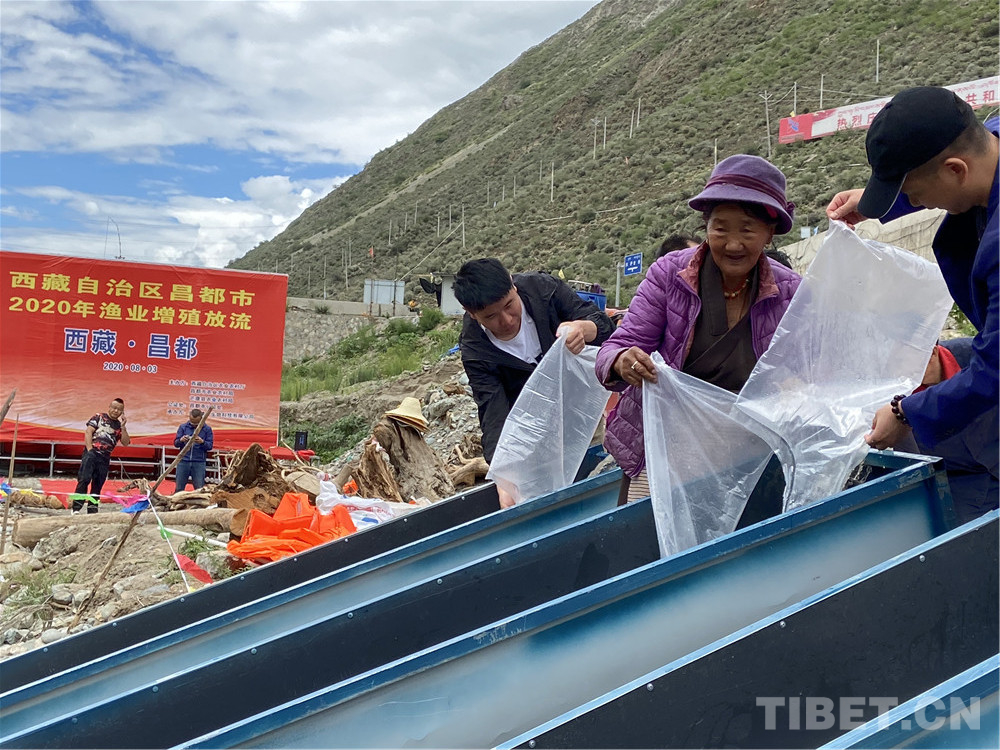 在工作人員協(xié)助下,老阿媽把一袋袋魚苗放入江中。據(jù)老阿媽說,當(dāng)年十八軍進(jìn)藏路過這里,帶的糧食不多,他們不向當(dāng)?shù)厝苏骷Z,有些人餓得浮腫。江河中的魚兒好抓,但沒有一個(gè)戰(zhàn)士違反紀(jì)律去抓魚。藏族敬畏魚,不捕魚,不吃魚。解放軍尊重當(dāng)?shù)仫L(fēng)俗,即使餓死也不抓魚充饑。