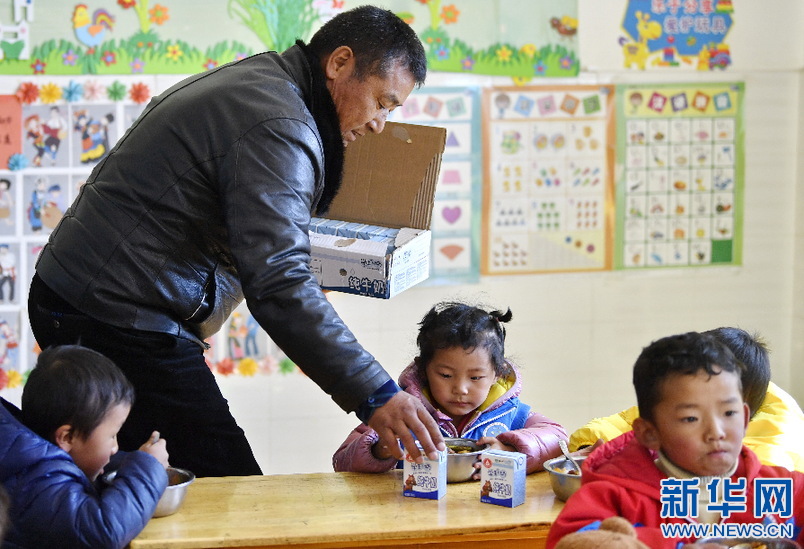 西藏山南市貢嘎縣吉雄鎮(zhèn)紅星社區(qū)雙語幼兒園的老師為孩子們分發(fā)牛奶(11月25日攝)。新華社記者 張汝鋒 攝