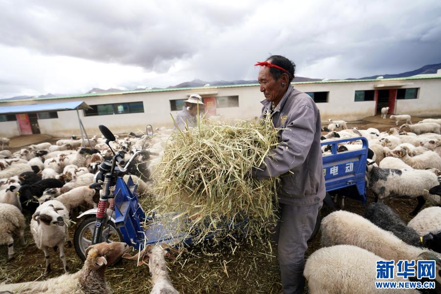 西藏日喀則市定日縣克瑪鄉(xiāng)幫布村村民頓珠在定日縣珠穆朗瑪崗巴羊規(guī)?;B(yǎng)殖產(chǎn)業(yè)園喂羊(7月31日攝)。頓珠2020年來到產(chǎn)業(yè)園打工,負(fù)責(zé)喂羊、打掃羊舍,每個(gè)月有3500元的收入。新華社記者 詹彥 攝