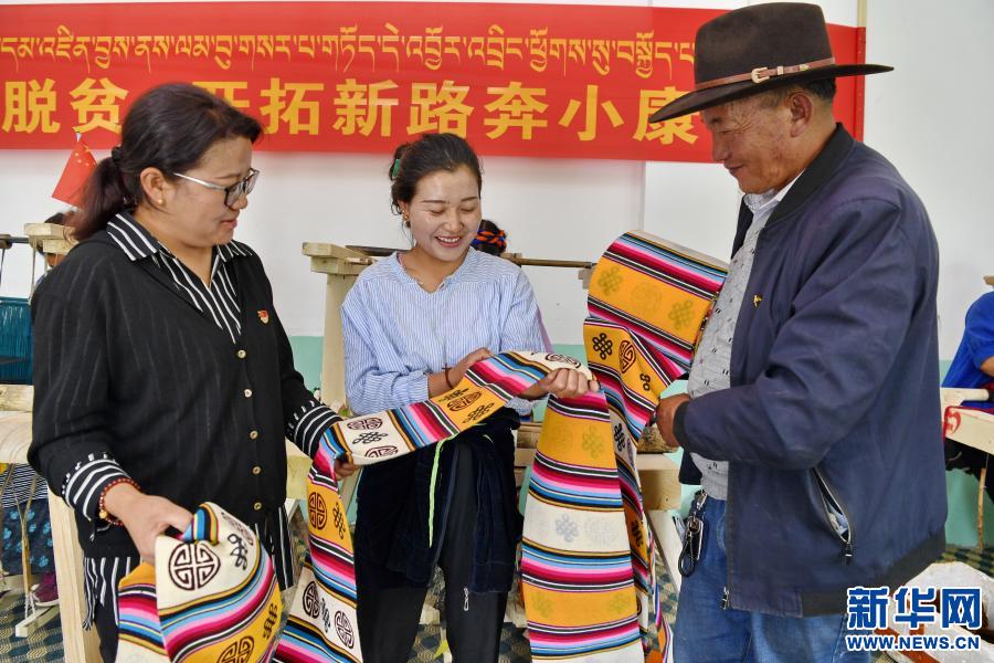 2020年7月6日,西藏扎囊縣吉汝鄉(xiāng)扎西林村駐村工作隊(duì)隊(duì)長(zhǎng)央珍(左)、黨支部書(shū)記旺扎(右)和專業(yè)合作社社員次旺曲珍查看民族手工業(yè)(邦典)質(zhì)量。 新華社記者 張汝鋒 攝