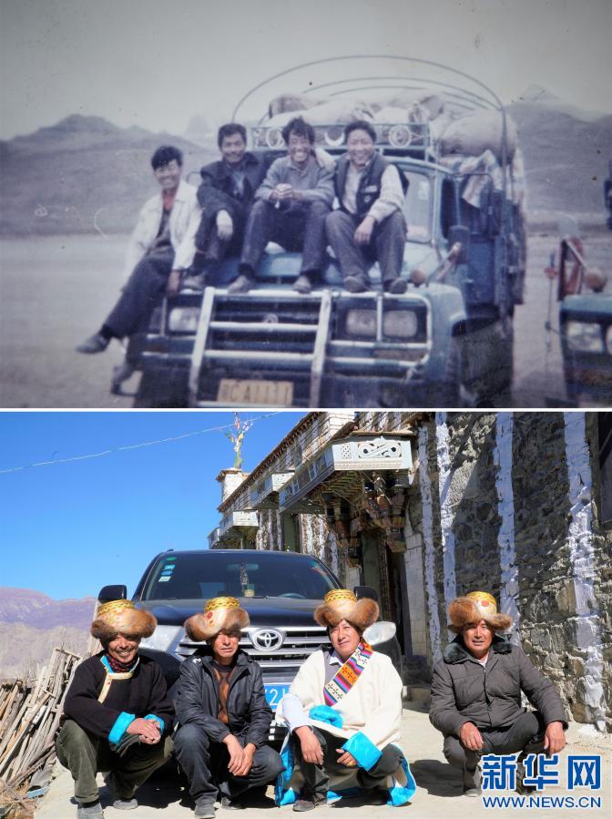 拼版照片:上圖:1994年,24歲的強(qiáng)巴(右二)和他的三個兄弟在西藏阿里地區(qū)跑運(yùn)輸時(shí),在自己購買的“東風(fēng)”牌運(yùn)輸車前合影(強(qiáng)巴提供)。(新華社發(fā))