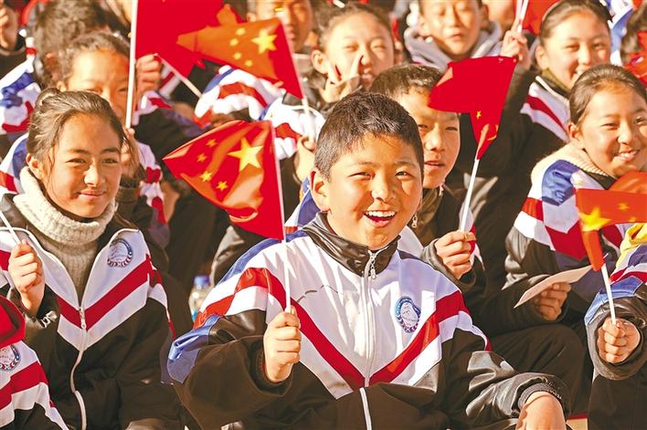 揮舞小國旗的西藏少年兒童。