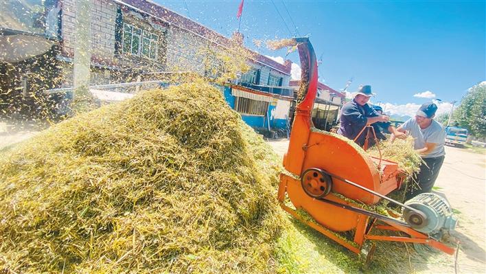 圖為達(dá)孜區(qū)農(nóng)牧民群眾利用機(jī)械切割飼草。記者 格桑倫珠 攝