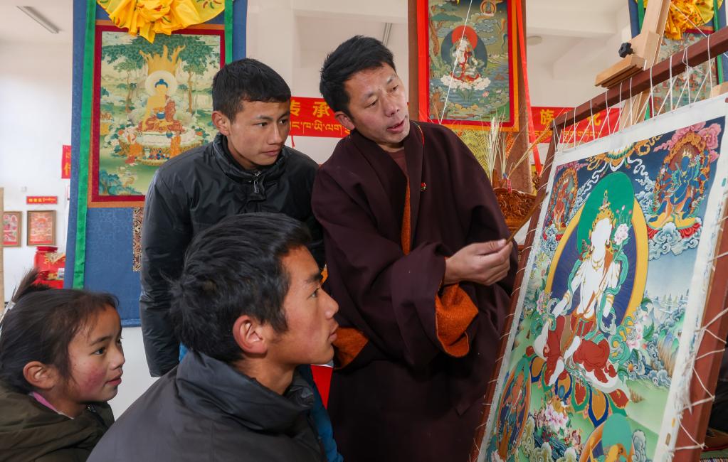 西繞尼瑪(右一)在講解關(guān)于唐卡繪制的知識(shí)(1月11日攝)。新華社記者 姜帆 攝