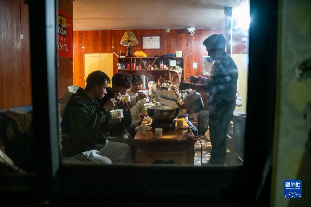 在珠峰游客大本營的帳篷旅館里,旦增(右)為客人的牦牛肉湯鍋里加湯料(5月16日攝)。新華社記者 孫非 攝