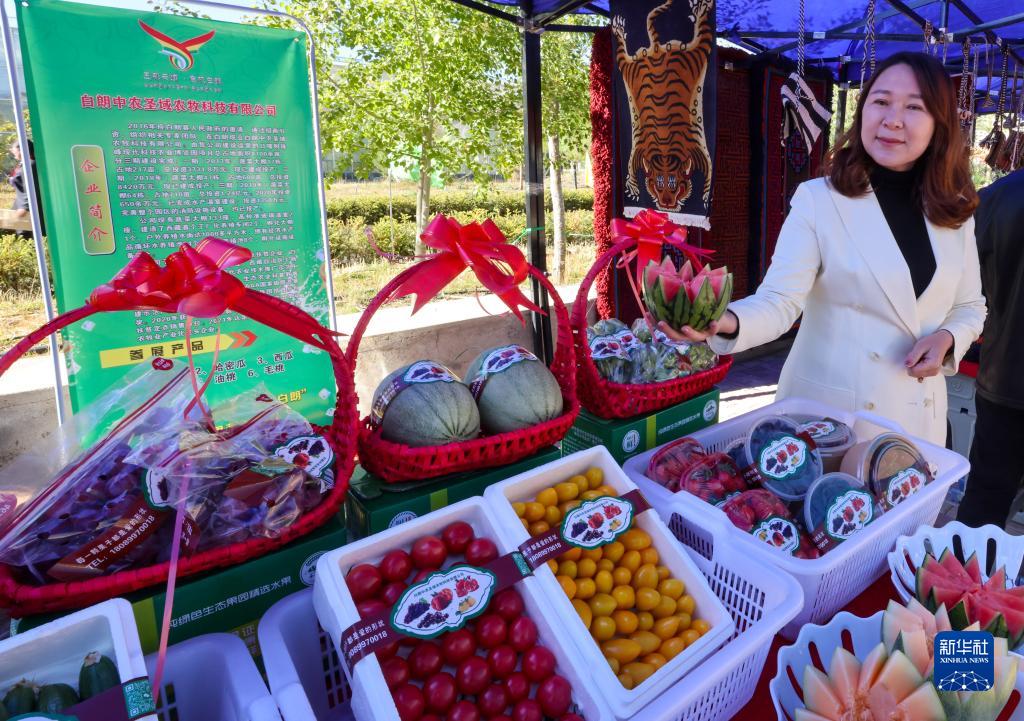 5月28日,珠峰博覽園的工作人員在第十屆白朗果蔬采摘節(jié)上展示自產(chǎn)的蔬菜、水果。新華社記者 姜帆 攝