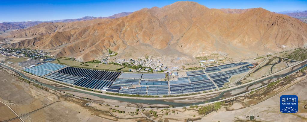 這是5月28日拍攝的白朗縣珠峰博覽園,目前園區(qū)共有高標(biāo)準(zhǔn)溫室大棚133座(無人機拼接照片)。新華社記者 姜帆 攝