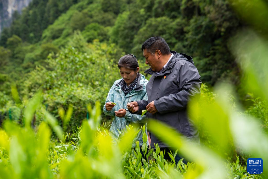 在勒門巴民族鄉(xiāng)的一處茶田,格桑旦增和女兒次仁旺姆正在查看茶葉生長情況(2023年6月27日攝)。新華社記者 孫非 攝