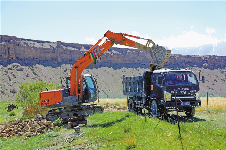 普蘭縣普蘭鎮(zhèn)仁貢村孔雀施工隊(duì)的機(jī)械車輛在施工,當(dāng)?shù)厝罕娫谄仗m縣普蘭鎮(zhèn)施工隊(duì)務(wù)工,一天可增收230元。記者 溫凱 攝