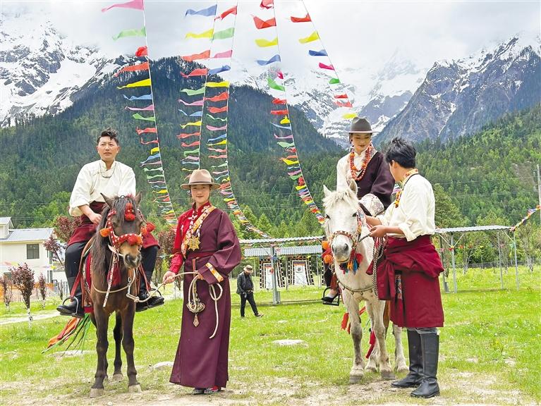 波密縣扎木鎮(zhèn)康木村坐落于318國(guó)道旁,風(fēng)景秀麗,群山環(huán)繞,很多自駕游的游客都會(huì)經(jīng)停于此體驗(yàn)藏家文化。 圖為游客在康木村,穿著藏裝體驗(yàn)騎馬樂(lè)趣。 圖片由本報(bào)記者 張猛 攝