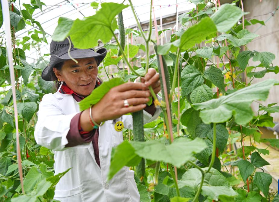 措勤縣高原生態(tài)畜牧業(yè)現(xiàn)代化養(yǎng)殖一體化產(chǎn)業(yè)綜合基地合作社社員在蔬菜大棚為西紅柿吊蔓(8月19日攝)。[詳細(xì)] -