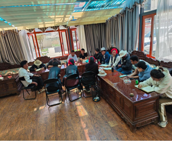 圖為駐村工作隊(duì)聽(tīng)取村江多村獸藥物資需求會(huì)議現(xiàn)場(chǎng)。新華網(wǎng)發(fā) 舒啟航 攝