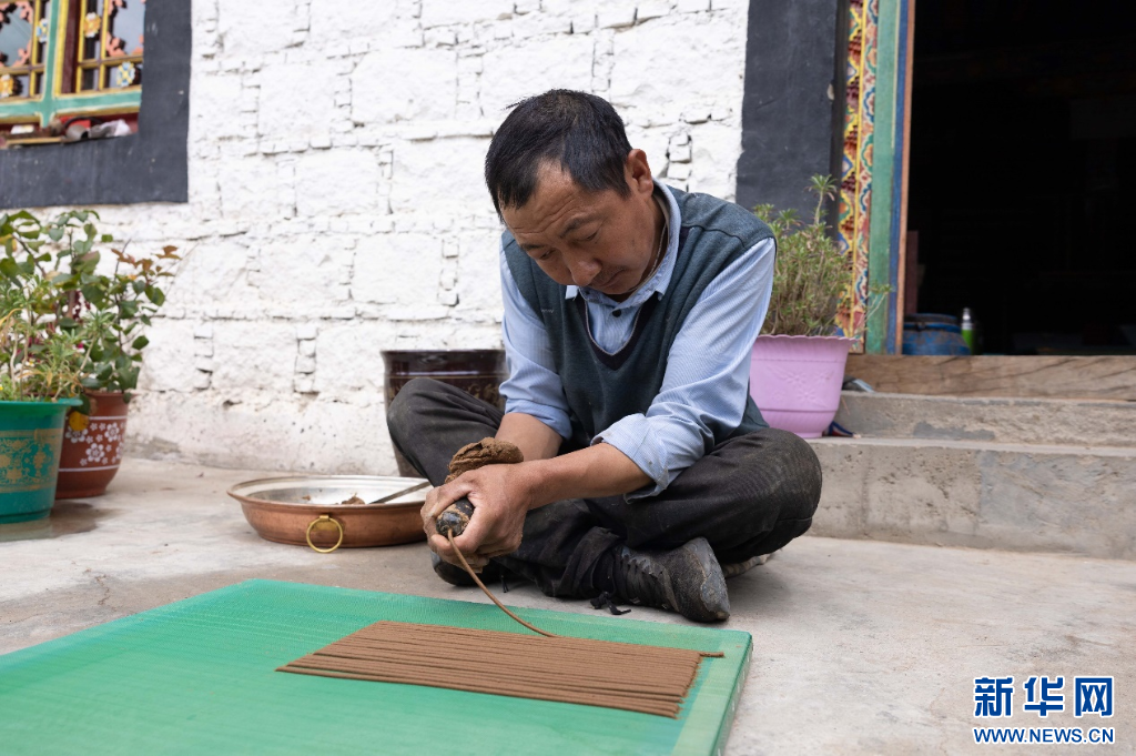 工作時,格桑次仁會盤腿坐于門前,熟練地揉搓著盆中的香泥,待其成型后再迅速放入帶孔的牛角中,用靈巧的手指擠出一道道筆直的線條,一根根均勻的藏香便呈現在人們的眼前。經過晾曬成型之后,這些藏香將會被送至附近的大小寺廟,或是通過電商渠道發(fā)往全國各地。
