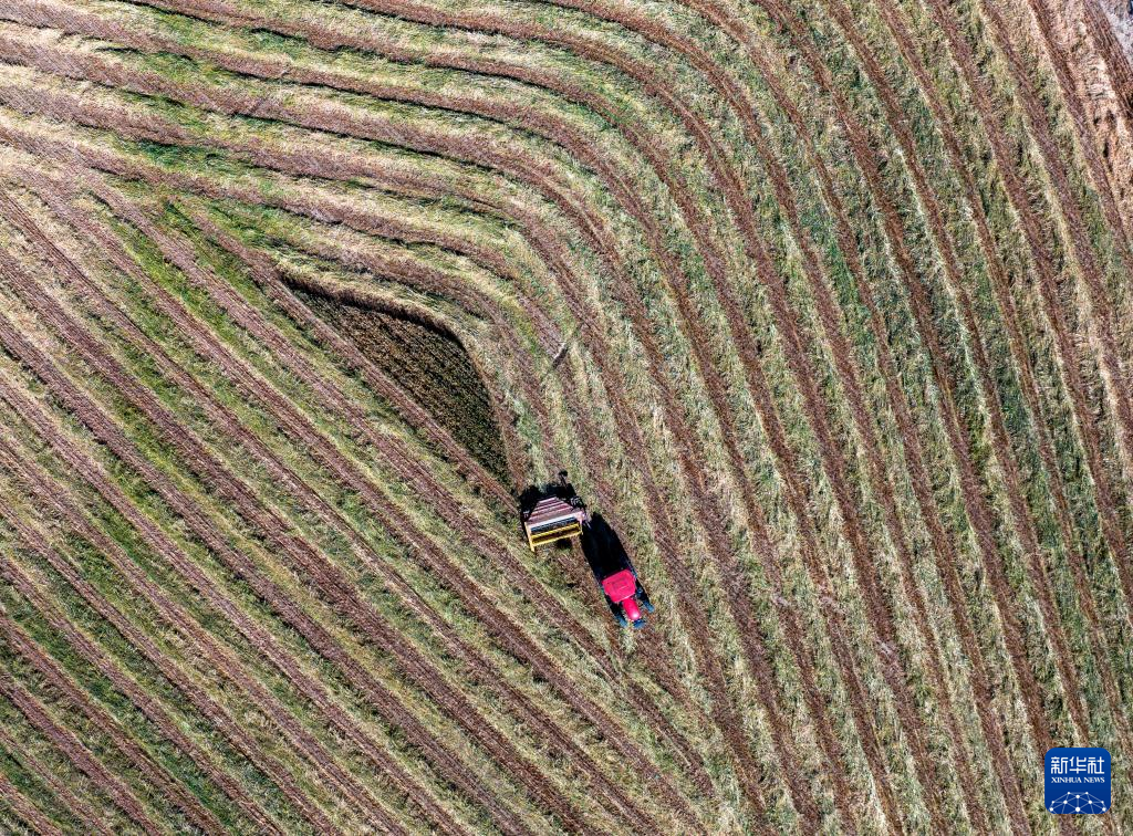 10月24日,村民駕駛農(nóng)機在拉薩市林周縣強嘎鄉(xiāng)曲嘎強村收割牧草(無人機照片)。新華社記者 姜帆 攝