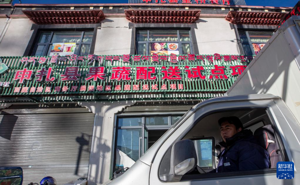 申扎縣供銷合作社的配送員巴拉從縣城總店出發(fā),為馬躍鄉(xiāng)貝嘎四村偏遠(yuǎn)鄉(xiāng)鎮(zhèn)果蔬配送試點(diǎn)項(xiàng)目直銷點(diǎn)運(yùn)送新鮮果蔬(1月5日攝)。新華社記者 姜帆 攝