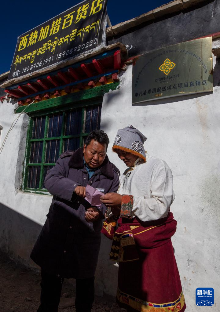 申扎縣供銷合作社的配送負(fù)責(zé)人吳瓦(左)與馬躍鄉(xiāng)貝嘎四村偏遠(yuǎn)鄉(xiāng)鎮(zhèn)果蔬配送試點(diǎn)項(xiàng)目直銷點(diǎn)店主西熱加措核對(duì)配送清單(1月5日攝)。新華社記者 姜帆 攝