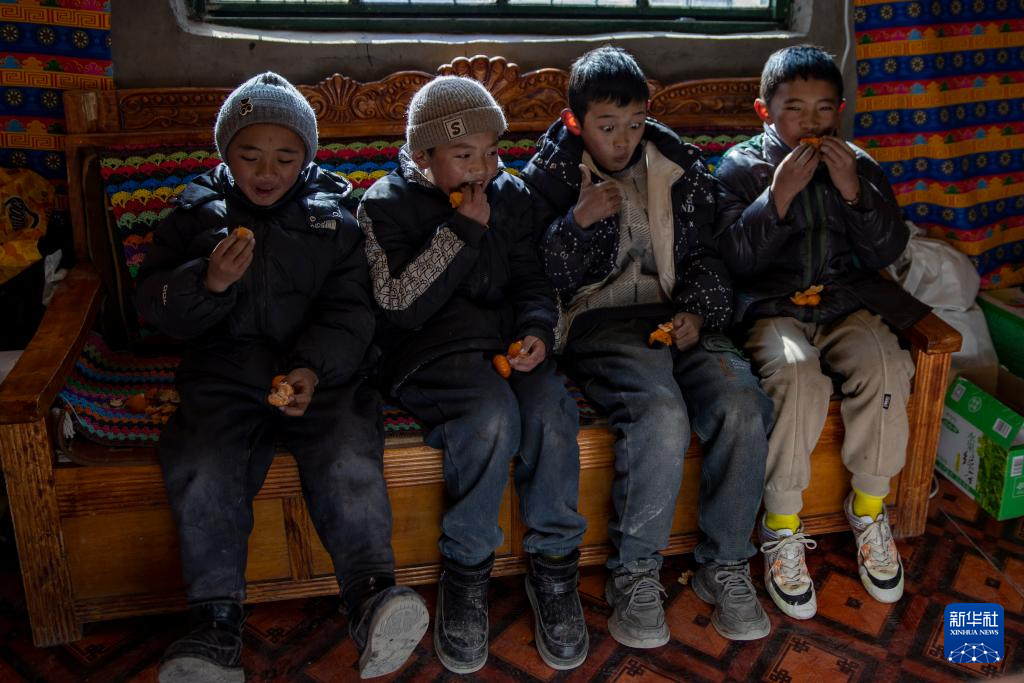 申扎縣馬躍鄉(xiāng)貝嘎四村的幾名小朋友在村里的“偏遠(yuǎn)鄉(xiāng)鎮(zhèn)果蔬配送試點(diǎn)項(xiàng)目”直銷點(diǎn),買來當(dāng)天供銷合作社配送來的新鮮水果品嘗(1月5日攝)。新華社記者姜帆 攝