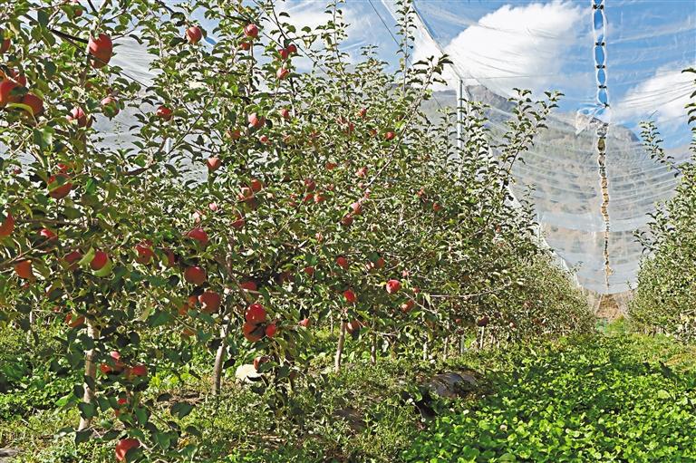 定睛一看,這里的蘋果生長環(huán)境確實不一般——蘋果樹住進(jìn)了配有“網(wǎng)帳”的“小區(qū)”。