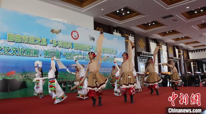圖為班戈縣“鄉(xiāng)村振興 那曲奮進(jìn)”活動(dòng)成果轉(zhuǎn)化暨文藝文化展演、第三屆畜產(chǎn)品展銷會(huì)開幕式歌舞演出。洛桑斯卓 攝