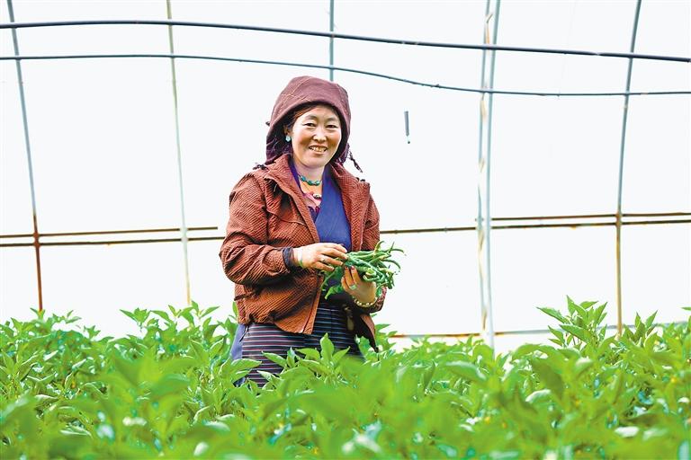 圖為當地群眾在大棚內采摘辣椒。記者 格桑倫珠 攝