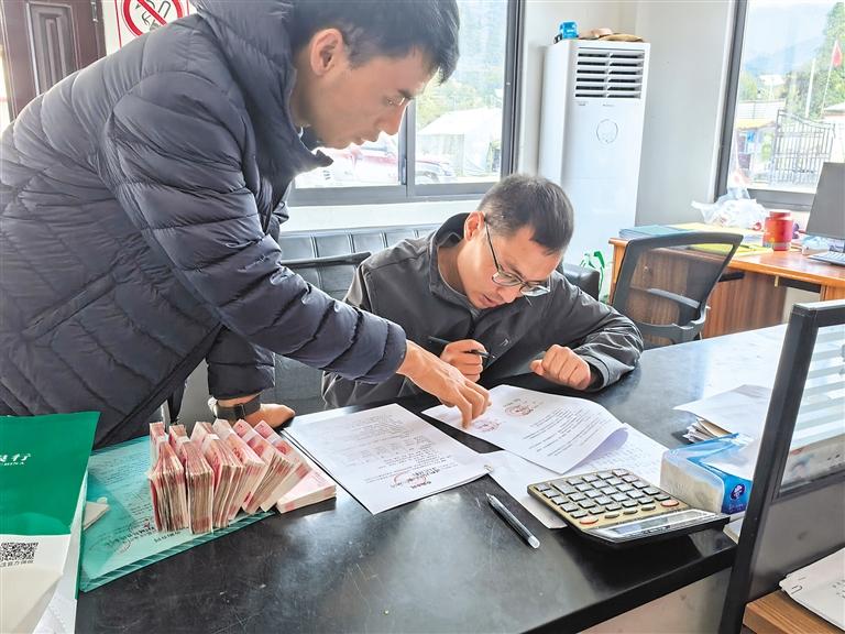 墨脫縣新創(chuàng)農業(yè)科技開發(fā)公司工作人員為波東村種植戶結算靈芝款。圖/文 記者 王珊 劉楓