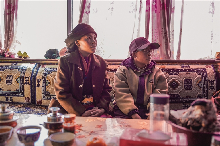 當(dāng)日,天空晴朗,在廣袤無垠、無樹木遮擋的曠野上,稍起一陣疾風(fēng),便會(huì)揚(yáng)起一層薄薄的黃沙。從村委會(huì)出發(fā),沿著冰湖畔的水泥小路前行,很快就來到了村民倫珠曲珍的家。一進(jìn)屋,厚實(shí)的木門便將凜冽的寒風(fēng)擋在了門外?!翱煺?qǐng)進(jìn),這幾天風(fēng)沙有點(diǎn)大,普莫雍措都沒以前藍(lán)了。”倫珠曲珍一邊關(guān)門一邊熱情地笑著說道。