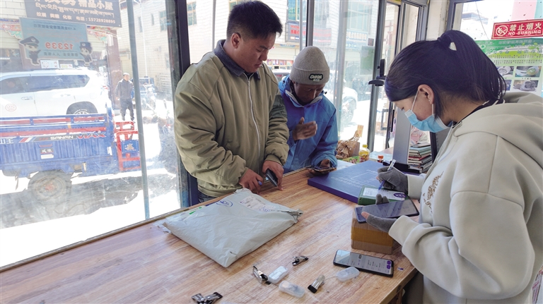定日縣中通快遞公司營(yíng)業(yè)網(wǎng)點(diǎn)也十分繁忙,幾位工作人員埋頭分揀,來(lái)這里發(fā)快遞的群眾在窗口外排隊(duì)辦業(yè)務(wù)。網(wǎng)點(diǎn)負(fù)責(zé)人秦女士介紹,中通快遞的網(wǎng)點(diǎn)已經(jīng)布設(shè)到定日縣的曲洛鄉(xiāng)、措果鄉(xiāng)、扎果鄉(xiāng)、扎西宗鄉(xiāng)等,而位于縣城的營(yíng)業(yè)網(wǎng)點(diǎn)還代收?qǐng)A通、申通、韻達(dá)、極兔等快遞公司的快遞,最近收件量特別大,網(wǎng)點(diǎn)11個(gè)員工每天從早上9點(diǎn)忙到晚上10點(diǎn)半,才能完成當(dāng)天的分揀、信息錄入和與郵政對(duì)接等工作。
