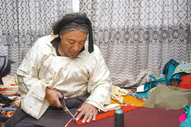 圖為次歐正在裁剪藏裝。記者 萬靖 攝