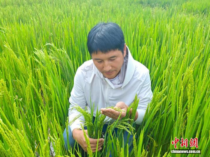 8月11日,范春捆在西藏山南加查縣冷達鄉(xiāng)共康村水稻田里觀察水稻孕穗情況。中新社發(fā) 陳立超 攝