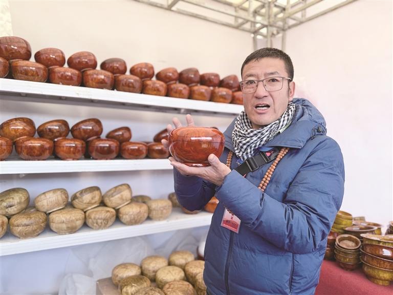 參展商戶們早早備好貨物,在展位前忙碌接待,不少人首日就收獲滿滿。不丹籍商戶扎西已是第二年參展,去年10萬元貨物售罄的好業(yè)績讓他今年信心倍增,帶來價值30萬元-40萬元的8個品種的產(chǎn)品,“物交會的人氣一年比一年旺,去年結(jié)識的本地合作伙伴今年還來進貨,加上今年有物流補貼和線上推廣,我的木碗能賣到更遠(yuǎn)的地方,太省心了。”加查縣商戶群培帶著自家手工制作的木碗連續(xù)參展20年,開幕僅一個多小時就入賬3000余元,他感慨道:“從跟著父親來擺攤到如今有了固定展位,物交會越辦越規(guī)范,如今不僅僅是本地顧客認(rèn)可我們的手藝,還有外地游客也會前來咨詢購買,生意越來越有奔頭。”
