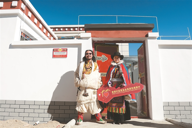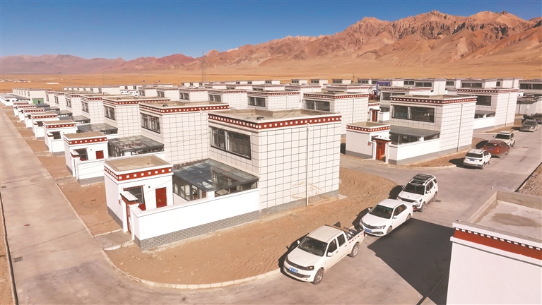 村民在自家新居門前合影。記者 永青 周輝 報(bào)道 圖片由改則縣融媒體中心提供