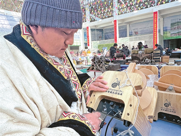 展銷商正在展示自己的新發(fā)明“古老藏北紡線車”。記者 萬靖 攝