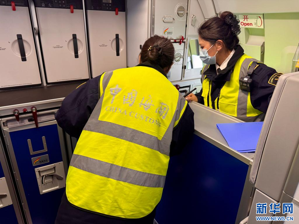 12月24日,拉薩海關(guān)關(guān)員對進口民航客機進行查驗監(jiān)管。(拉薩海關(guān)供圖)