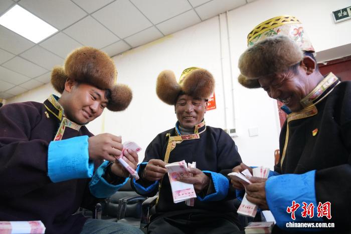 圖為在分紅現(xiàn)場,村民數(shù)錢。曲杰 攝
