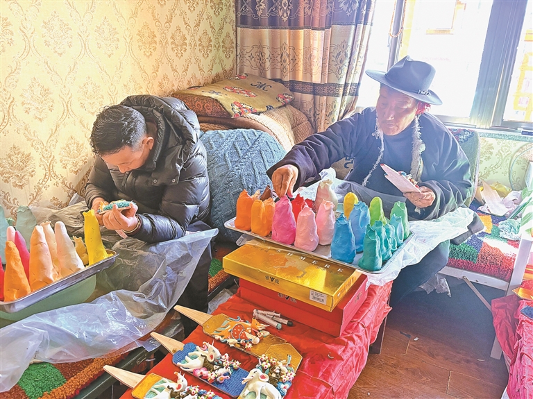 多年來,羅布累計(jì)培養(yǎng)了400多名學(xué)徒。每年藏歷新年前,他都會組織為期一個(gè)月的集中培訓(xùn),之后帶著大家到拉薩共同參與酥油花創(chuàng)作。不少學(xué)徒學(xué)成后技藝精湛,靠著這門手藝站穩(wěn)了腳跟。如今,酥油花制作已成為當(dāng)?shù)卮寮w經(jīng)濟(jì)發(fā)展的重要支柱,更是改善群眾生活的主要收入來源,村里不少家庭全家參與制作,人人都是技藝傳承人。