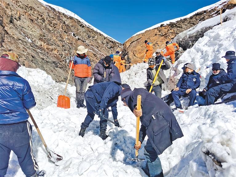 2022年10月底,洛扎縣突降大雪,農(nóng)牧民群眾的生命財產(chǎn)安全受到嚴(yán)重威脅,堅(jiān)增羅布又一次向組織申請,主動前往自己熟悉的色鄉(xiāng)曲吉麥放牧點(diǎn)參與緊急救援工作。他在山谷中鏟雪、碎冰、清理河道,連續(xù)奮戰(zhàn)12天,竭力尋找失蹤牧民,成功轉(zhuǎn)運(yùn)200多頭牦牛,最大限度維護(hù)了群眾生命財產(chǎn)安全。