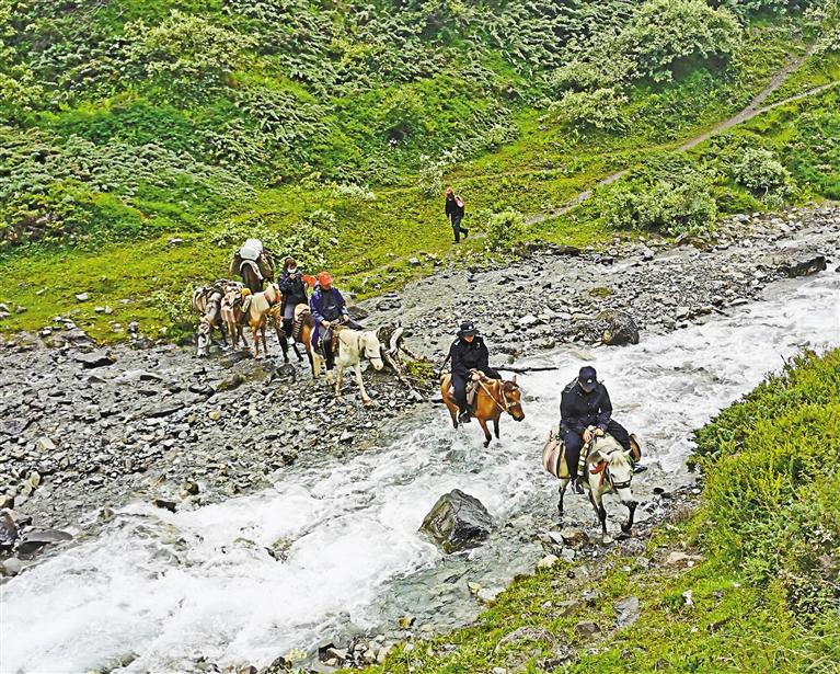 圖為貢當(dāng)邊境派出所民警騎馬護(hù)送村民及物資前往冬蟲夏草采挖區(qū)。西藏日報(bào)記者 張宇 通訊員 季馨 攝
