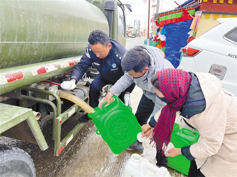 每年10月后,阿里地區(qū)便進入漫長的冬季。巴嘎鄉(xiāng)崗莎村因塔爾欽曲河道結(jié)冰,當?shù)厝罕娚钣盟掷щy。塔爾欽邊境派出所組建黨員服務(wù)小分隊,每周都會按時調(diào)用水車從水井抽水,為轄區(qū)居民集中送水。