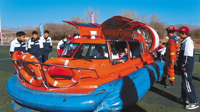 圖②:學(xué)生體驗消防救援艇。