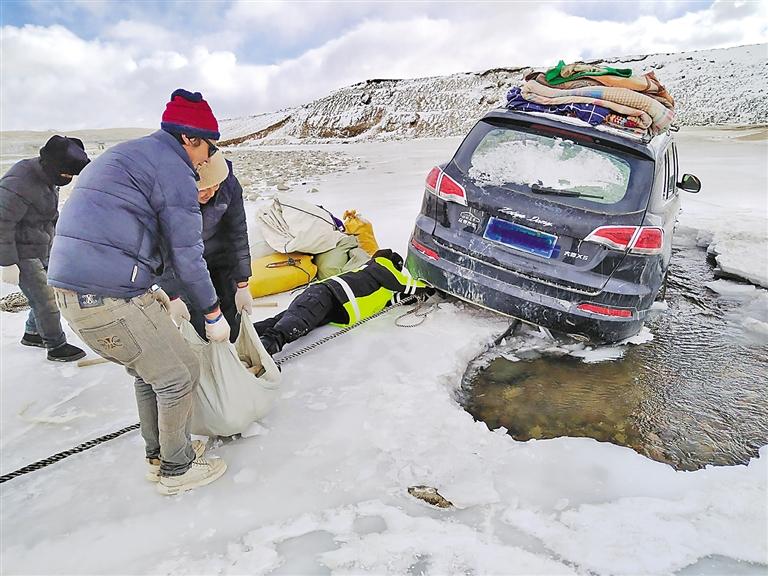 2月16日,聶榮縣公安局桑榮鄉(xiāng)派出所接到轄區(qū)群眾報(bào)警求助,稱其在前往冬季牧場途中,車輛不慎陷入結(jié)冰河道,無法自行脫困。接警后,派出所立即組織警力攜帶救援工具第一時(shí)間趕到現(xiàn)場,只見,被困車輛右側(cè)輪胎陷入冰層,動(dòng)彈不得。對此,民(輔)警迅速采取救援措施,冒著嚴(yán)寒使用鐵鍬鑿開并清理輪胎周圍冰層,俯臥在冰面上,為車輛綁上拖車?yán)K,采取車?yán)送频确绞?,全力幫助車輛脫困。最終,經(jīng)過五個(gè)多小時(shí)的不懈努力,成功將被困車輛拖拽至安全地帶。
