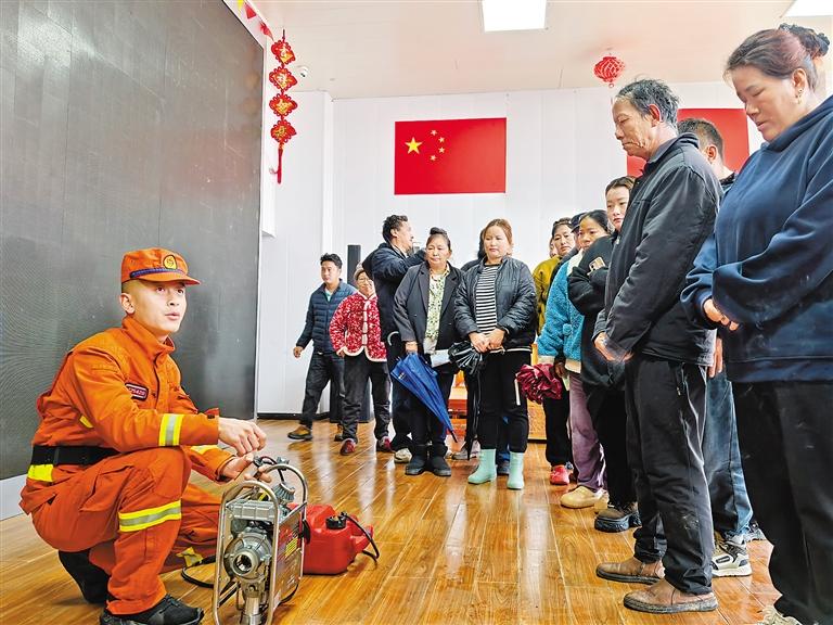 圖為消防員向當?shù)厝罕娭v解消防器材的使用方法。 記者 楊小娟 通訊員 蔡安 攝