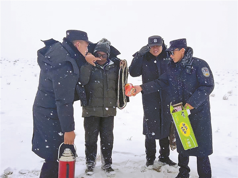 圖為嘎色(左一)和同事在風(fēng)雪中給群眾送去熱水和食物。圖/文 記者 王敏 通訊員 郭遠(yuǎn)敬