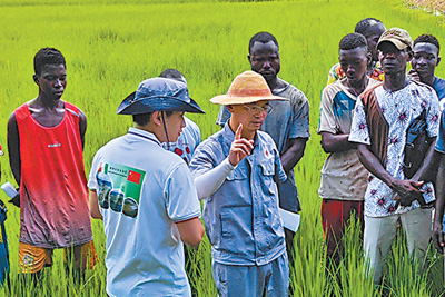 中國(guó)農(nóng)業(yè)專(zhuān)家為科特迪瓦農(nóng)民進(jìn)行水稻病蟲(chóng)防治的培訓(xùn)。