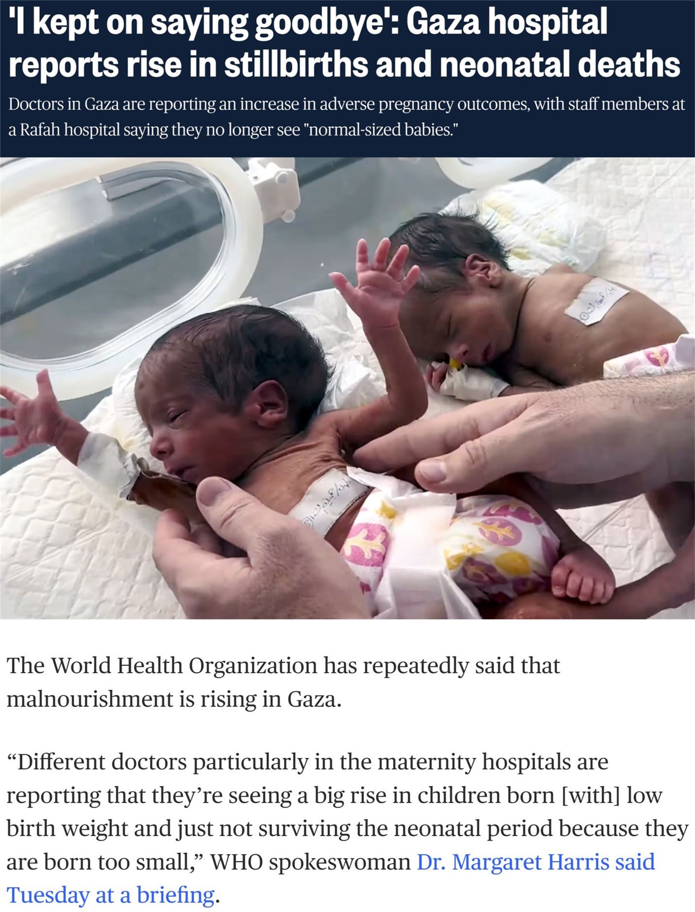 世界衛(wèi)生組織日前警告,加沙新生兒的死亡率正在直線上升。此外,還有大量嬰兒的體重達不到正常標準,導(dǎo)致他們過早夭折。