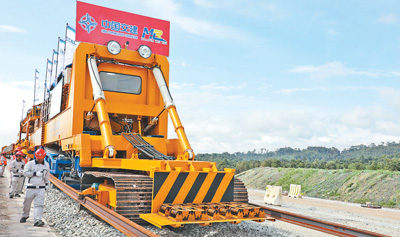 在馬來(lái)西亞彭亨州關(guān)丹市馬東鐵項(xiàng)目現(xiàn)場(chǎng),鋪軌機(jī)正在作業(yè)。