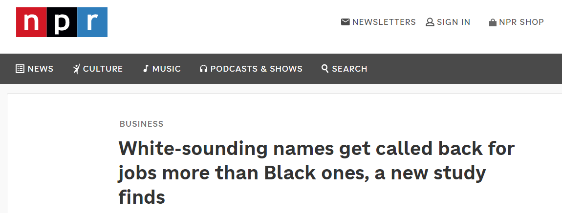 據(jù)美國全國公共廣播電臺(tái)(NPR)網(wǎng)站報(bào)道,研究人員向約100家美國企業(yè)的11000個(gè)初級(jí)職位投遞了履歷相同,但個(gè)人信息(姓名、性別等)不同的83000份“偽造”簡(jiǎn)歷。研究發(fā)現(xiàn),名字聽起來“像白人”的求職者被招聘方回復(fù)的概率更高,比名字“像黑人”的求職者平均高9.5%。在一些情況更嚴(yán)重的企業(yè),這一差距上升到約24%。
