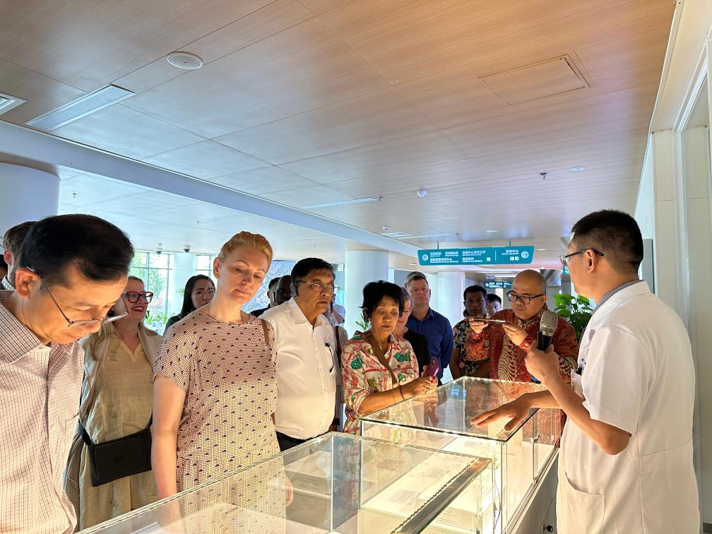 圖為駐華使節(jié)在博鰲樂城國際醫(yī)療旅游先行區(qū)里的一家醫(yī)院內(nèi)考察。新華社記者 袁睿 攝