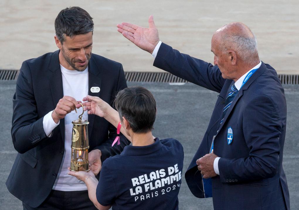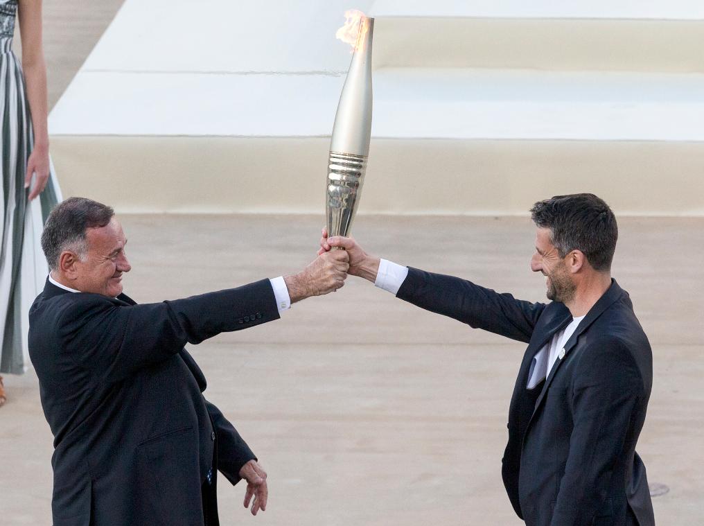 4月26日,巴黎奧組委主席埃斯坦蓋(左)將巴黎奧運(yùn)會(huì)火種燈交給工作人員。新華社發(fā)(馬里奧斯·羅洛斯攝)