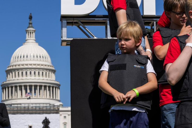 2022年6月6日,學生們身穿防彈衣在美國華盛頓的國會大廈前參加名為“不要回避”的抗議活動,呼吁立法機構(gòu)正視美國槍擊案頻發(fā)的社會問題,要求加強槍支管控立法。新華社發(fā)(亞倫攝)