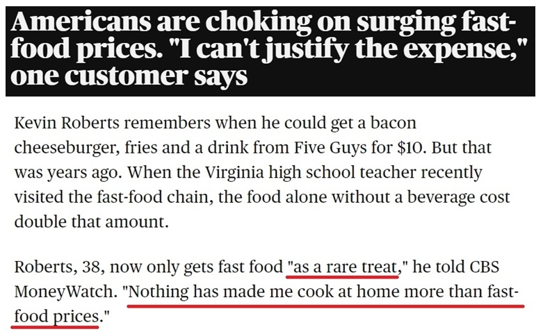 曾經(jīng)人人吃得起的快餐對普通美國人的意義不言而喻。但因?yàn)轭B固的通貨膨脹,這個意義現(xiàn)在已經(jīng)變了味。